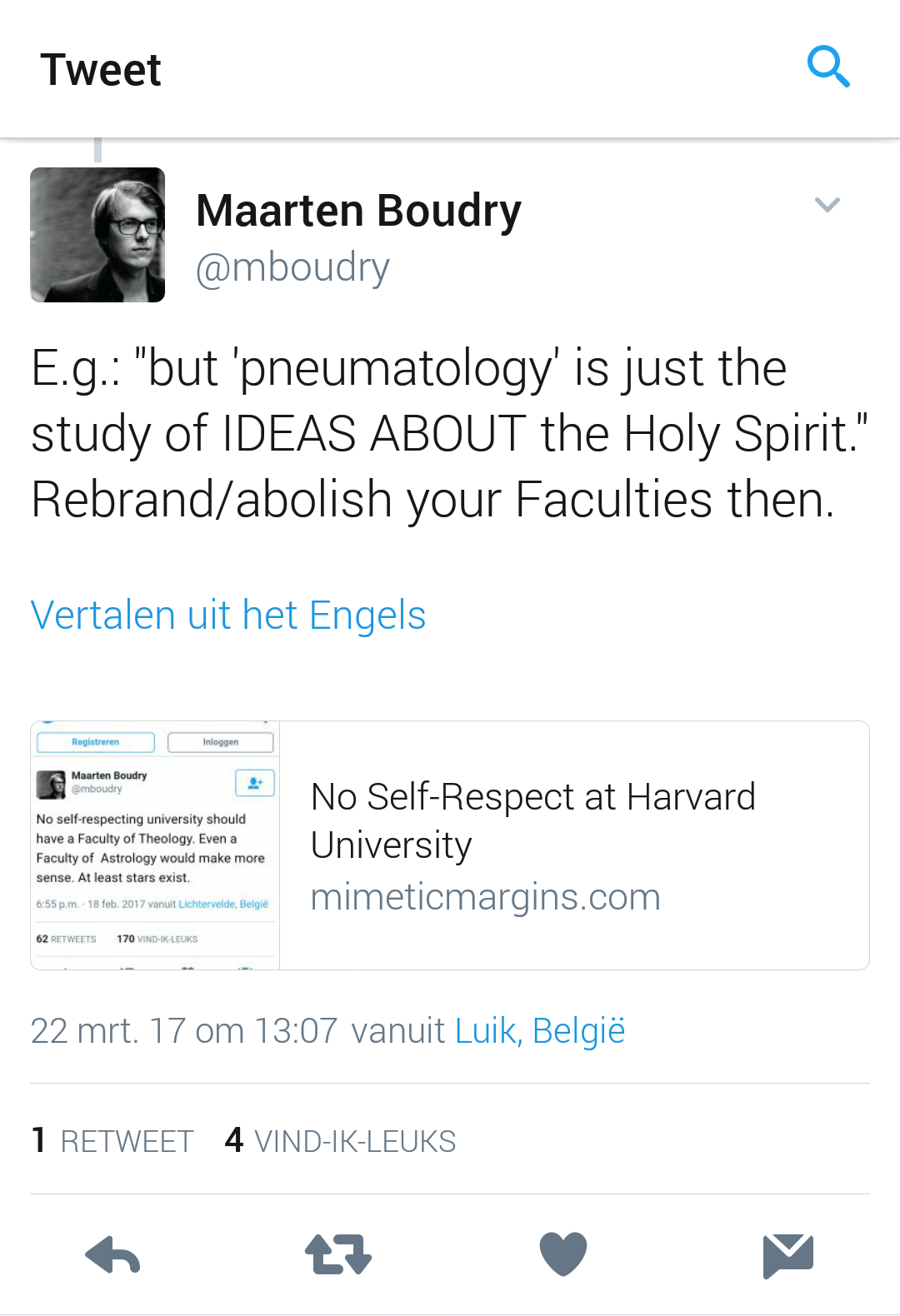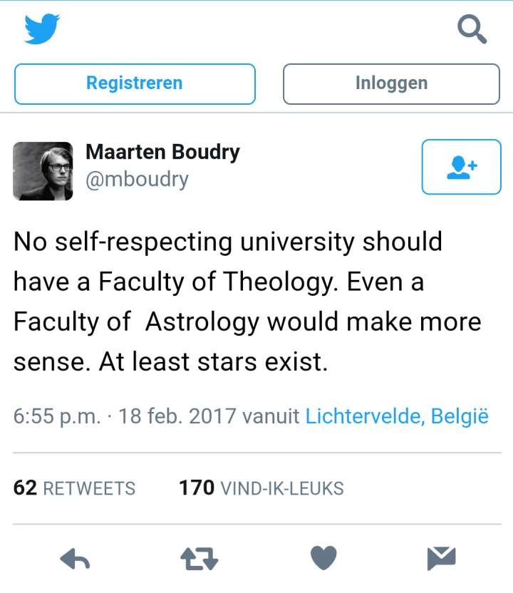 Some atheists nowadays are a bit confused as to what contemporary theology is all about, also in Belgium. Hence it is no surprise that Maarten Boudry, a quite public philosopher of science and a devoted opponent of all things religious, could tweet the following statement: