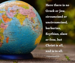“Bekleed u met de nieuwe mens, die wordt vernieuwd tot het ware inzicht, naar het beeld van zijn schepper. Dan is er geen sprake meer van Griek of Jood, besnedene of onbesnedene, barbaar, Skyth, slaaf, vrije mens. Maar alles in allen is Christus.”